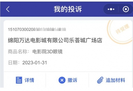回到成都上班后,刘女士在社交平台看到有同样经历的网友投诉维权成功的帖子,于是也在12315小程序上进行了投诉。她告诉记者,目前投诉进度显示是“待受理”。刘女士说,现在想起来仍觉得有些气愤,她认为看3D电影提供3D眼镜本就不应该由消费者去承担成本,期待能尽快收到投诉处理结果。