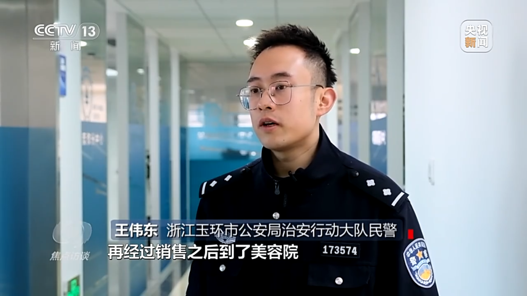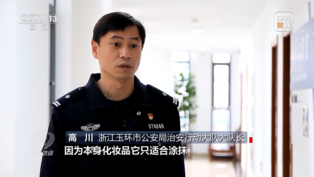 浙江玉环市公安局治安行动大队大队长高川:因为本身化妆品只适合涂抹,对涂抹类可能有一定的除皱功能,但是注射的话就会出现一系列反应,比如,皮肤部分红肿,或者对皮肤的肌肉有一定影响。