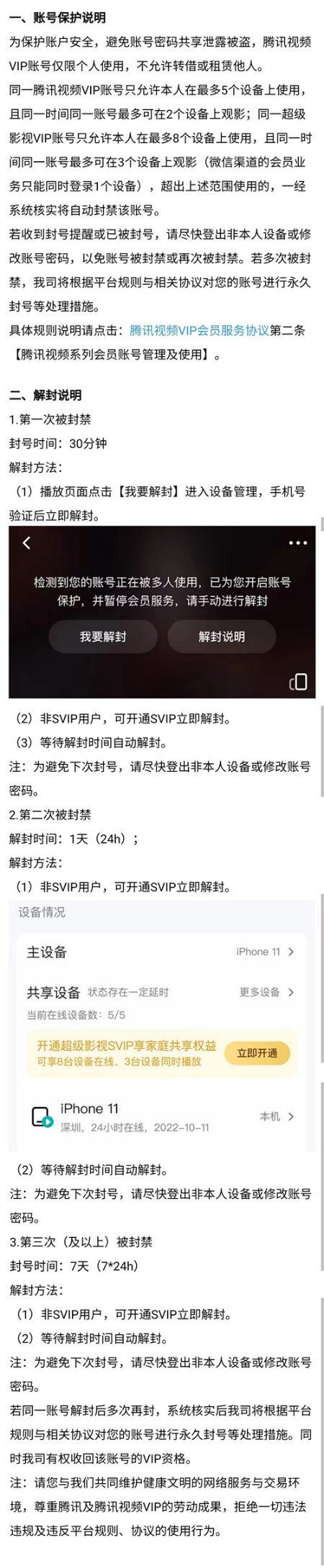 据悉,腾讯视频首次被封禁封号时间为30分钟,解封方法包括:手机号验证后立即解封;非SVIP用户,可开通SVIP立即解封;等待解封时间自动解封。第二次被封禁时间延长至一天,第三次延长至7天。第二次、第三次被封后,解封方法为:非SVIP用户,可开通SVIP立即解封;等待解封时间自动解封。同一账号解封后多次被封,系统核实后腾讯将根据平台规则与相关协议对账号进行永久封号等处理措施,同时有权收回该账号的VIP资格。
