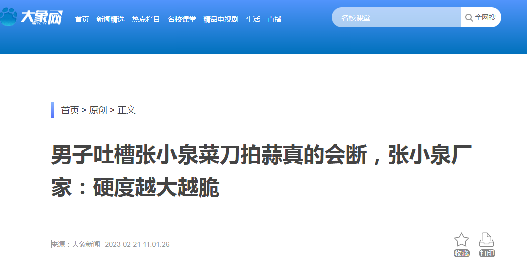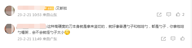据大象新闻2023年2月21日报道,2月20日,江苏徐州一消费者吐槽称,用张小泉(SZ301055,股价15.79元,市值24.63亿元)菜刀拍蒜后,刀断成两截。