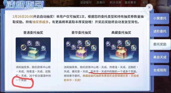 据悉,巽风此次的委托分为普通委托和进阶委托,普通委托开出的材料有限。进阶委托需要充值,充值分为198档次和398档次,充值398元可以进阶典藏版委托,可以获得8 张抽奖券。巽风app明确表示,8张抽奖券显示极高的概率获得一个或多个高级物品(阑欢意天成或趁年华天成)。