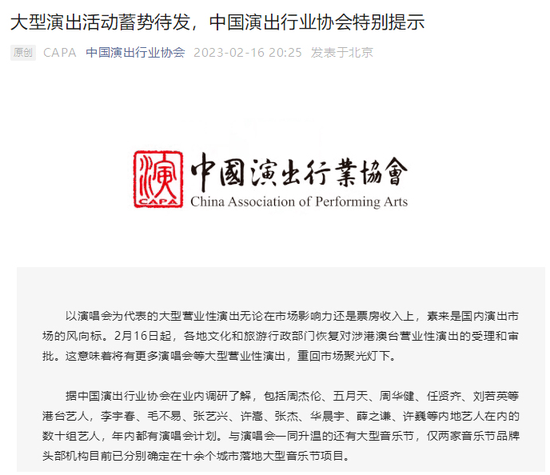 此前,中国演出行业协会发文称,2月16日起,各地文化和旅游行政部门恢复对涉港澳台营业性演出的受理和审批。这意味着将有更多演唱会等大型营业性演出,重回市场聚光灯下。
