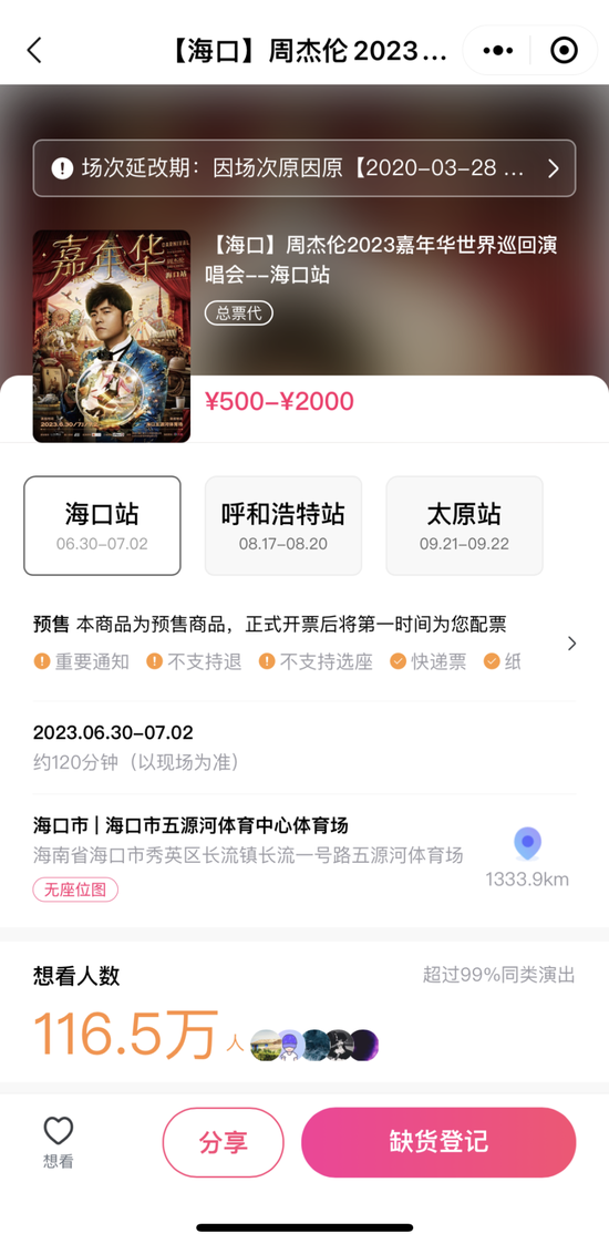 2月23日晚,周杰伦演唱会海口站又宣布将于6月30日至7月2日在海南省海口市五源河体育中心体育场举办。