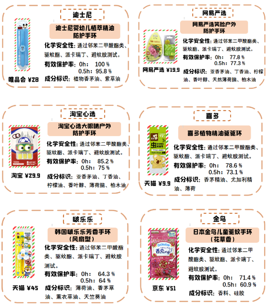 检测结果显示,19款驱蚊环和驱蚊贴均未能达到完全驱蚊(即有效保护率100%)。表现较差的一款样品(日本叮叮防敏驱蚊贴)在打开包装立即测试(0h)这一时间点(2分钟的测试时间),有蚊子攻击18次之多。露安适婴儿植物防护贴在第一阶段的测试中能达到95.5%的有效保护率,但在半小时后的测试中该样品的有效保护率仅剩50%。
