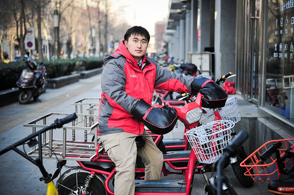 2017年12月13日,天津。来自唐山的王楠是微生物学的研究生,“双十二”刚过,快递员们又忙碌起来。这一天,王楠和他的同事们加班到夜里十点多。他表示相比微生物,他更爱跟人打交道。