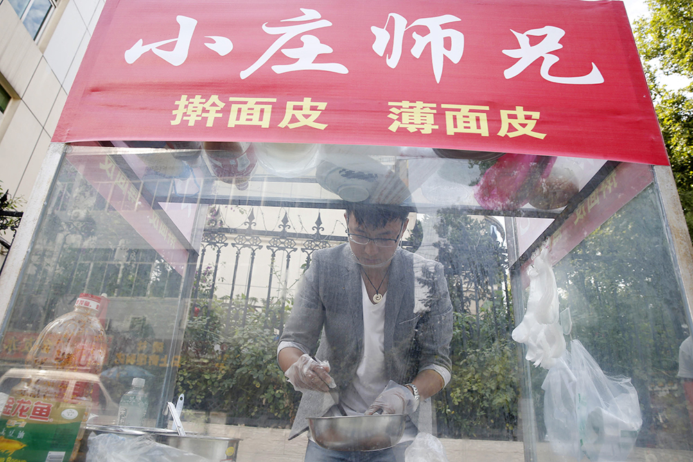 2015年9月23日,陕西西安,西安交通大学研究生庄栋放弃世界500强企业部门主管岗位及20余万元的年薪,在校门外卖凉皮。庄栋和弟弟庄楠一起蹬着三轮车摆摊。