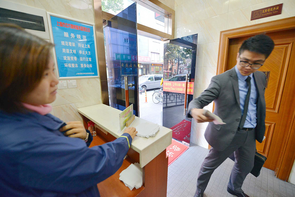 2014年11月20日,上海,80后大学本科毕业生曹锦是多伦路25号旅游公厕保洁员,本科毕业的她会说两国外语。曹锦在公厕保洁岗位上用心工作,被评为申城市容环卫系统十大“最美保洁员”之一。
