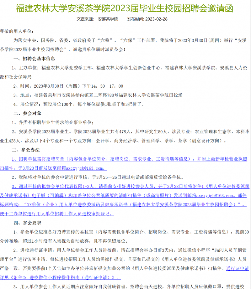 据北青报,记者搜索发现,福建农林大学安溪茶学院的这一场招聘会在3月30日下午举行,由福建农林大学党委学工部、福建农林大学学生创新创业中心、福建农林大学安溪茶学院、安溪县人力资源和社会保障局联合举办。该校官网于今年2月28日发出《福建农林大学安溪茶学院2023届毕业生校园招聘会邀请函》。