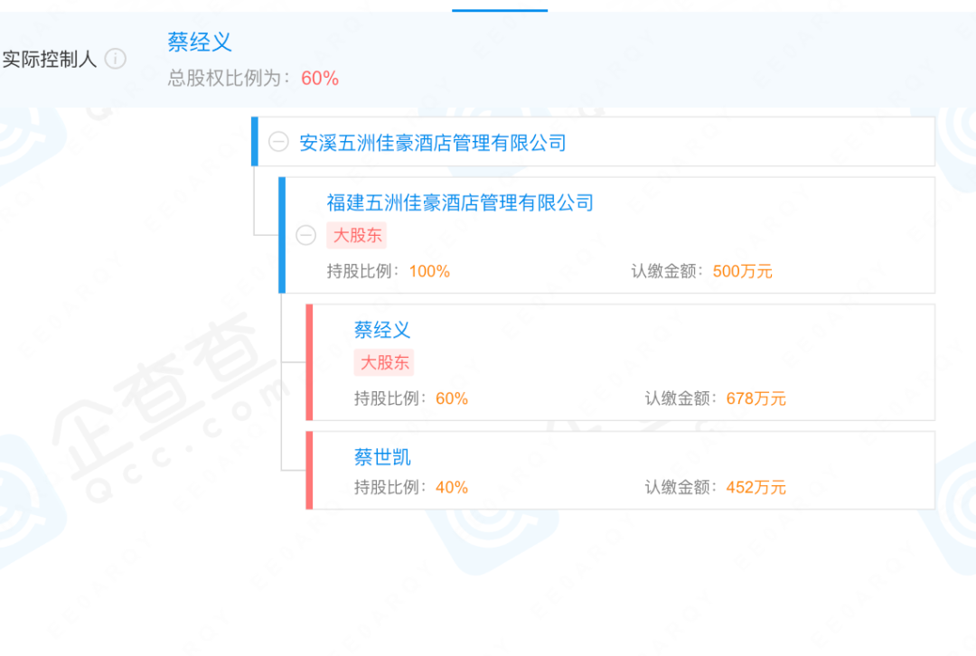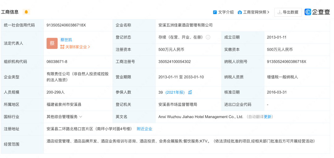 据企查查APP显示,安溪五洲佳豪酒店管理有限公司成立于2013年1月11日,注册地位于安溪县二环路北格口宫片区(南坪小学对面4号楼),法定代表人为蔡世凯,疑似控制人为蔡经义。经营范围包括酒店经营管理、酒店品牌开发、酒店业务培训与咨询、酒店投资、会务会展服务;餐饮服务;KTV。(依法须经批准的项目,经相关部门批准后方可开展经营活动)。