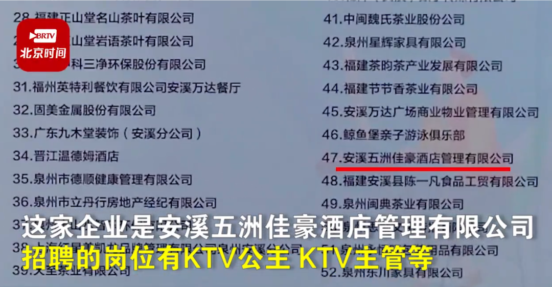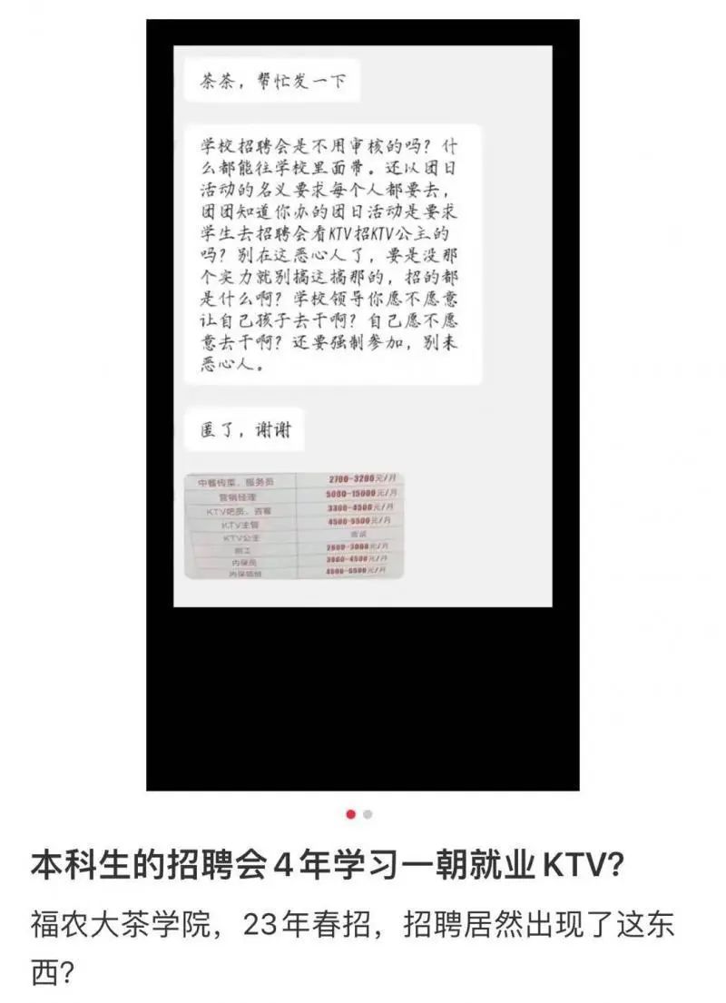 近日,网传“福建农林大学安溪茶学院春招现场,有企业在招聘‘KTV公主’”。