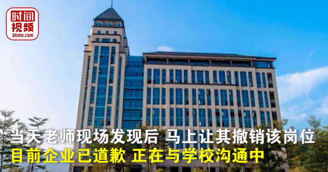 另据北京时间,4月4日,该校负责招聘会的老师表示审批时并没有该岗位,是企业私自带来的。当天老师现场发现后,马上让其撤销该岗位,目前企业已道歉,正在与学校沟通中。