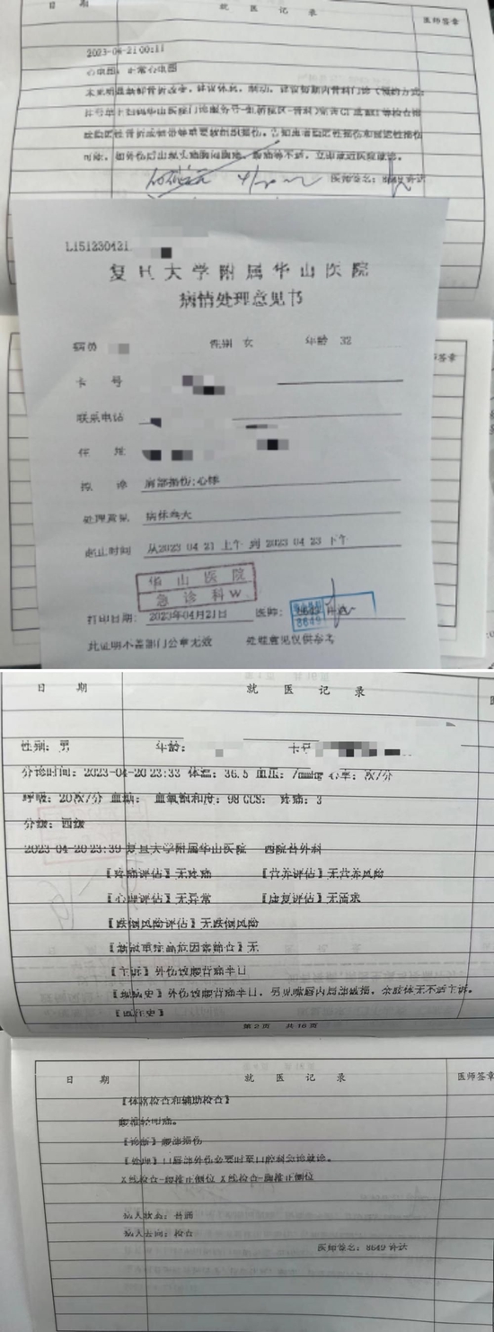 4月20日晚上10点过,Tongtong离开派出所后,又和同行朋友前往上海华山医院验伤,据她介绍:“我受到了惊吓一直心跳加速,我朋友嘴唇在被强制拖拽的过程中撞破流血,腰部被撞击疼痛,医生开具了病假条并叮嘱好好休息。”