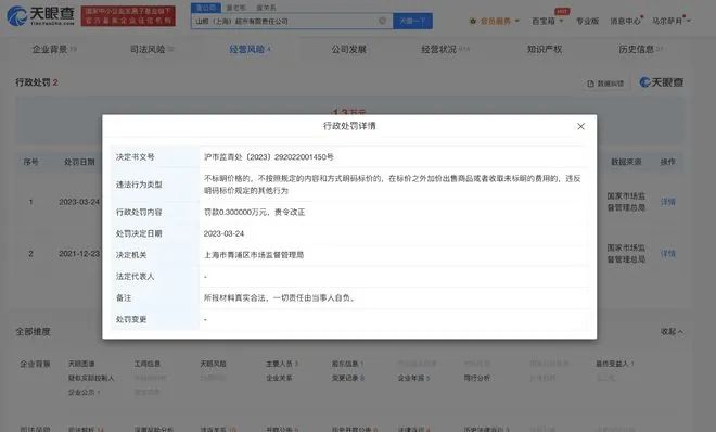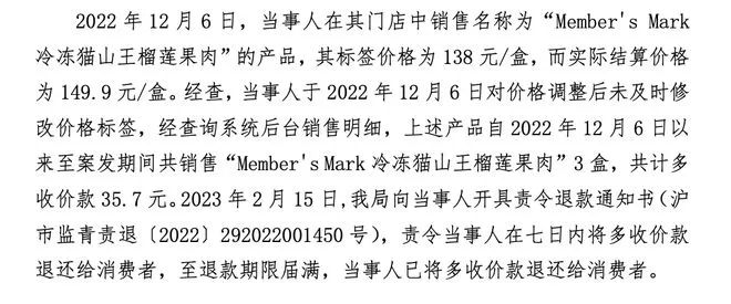 天眼查App显示,不久前,山姆(上海)超市有限责任公司曾因在标价之外加价出售商品被上海市青浦区市场监督管理局罚款3000元,具体处罚事由为,当事人在其门店销售“Member's Mark 冷冻猫山王榴莲果肉”,标签价格为138元/盒,而实际结算价格为149.9元/盒。经查,当事人对价格调整后未及时修改标签,案发期间共销售3盒,多收价款35.7元。