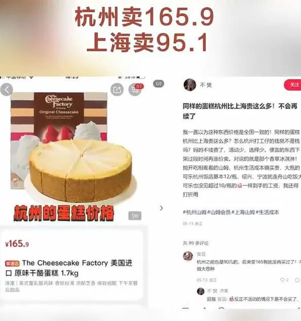 山姆超市同款蛋糕杭州卖165元上海卖95元!网友:可以花钱但不能当冤大头