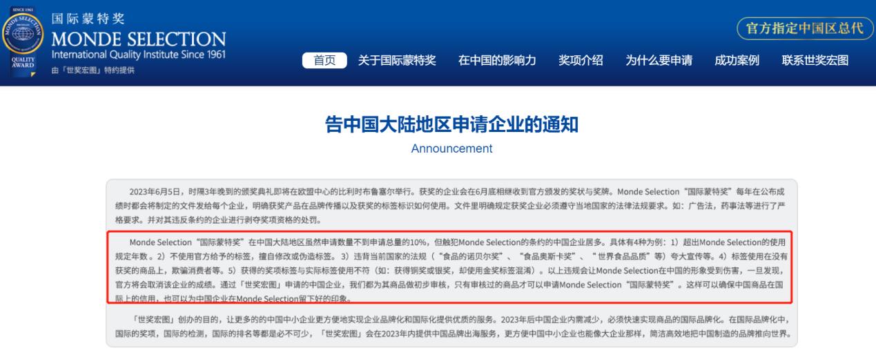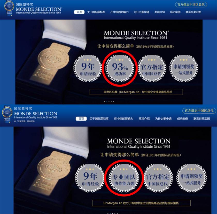 未来网记者注意到,近日,“国际蒙特奖”中国区总代理官网发布了一份《告中国大陆地区申请企业的通知》,指出Monde Selection国际蒙特奖在中国大陆地区虽然申请数量不到申请总量的10%,但触犯Monde Selection条约的中国企业居多。具体表现在诸多方面:不使用评奖机构给予的奖项标签,擅自修改或伪造奖项标签;奖项标签“使用在没有获奖的商品上,欺骗消费者”;“获得的奖项标签与实际使用标签不符(如:获得银奖或铜奖,却使用金奖标鉴混淆”。此外还有违背国家法规进行“食品界诺贝奖”“食品界奥斯卡奖”“世界食品品质”等夸大宣传。该《通知》表示,以上违规会让国际蒙特奖在中国的形象受到伤害。