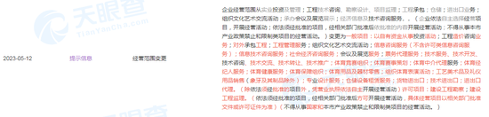 直至2023年5月,虹桥国际工商信息的经营范围内才增加了体育竞赛组织、体育赛事策划、组织体育表演活动等。