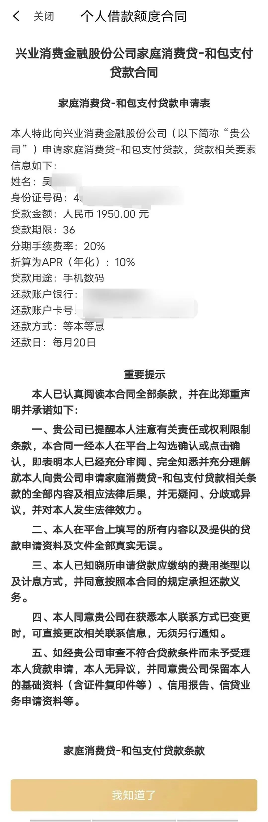 记者发现,这个所谓的贷款合同上写明了“本人已认真阅读本合同全部条款”,而吴先生表示,他并未被告知,也根本不知道兴业金融办贷款的事,他也是查询后才知道的。
