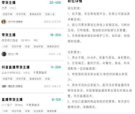 开菠萝财经搜索BOSS直聘发现,招聘带货主播的企业非常多,月薪普遍显示在1万以上,但在详情页面,需要主播掌握的能力很多,除了基本的直播经验,还要有成熟的自媒体运营经验,成熟的自媒体账号,熟练掌握直播销售手段等,“无经验”“小白”“新手”基本上不在招聘范围内。