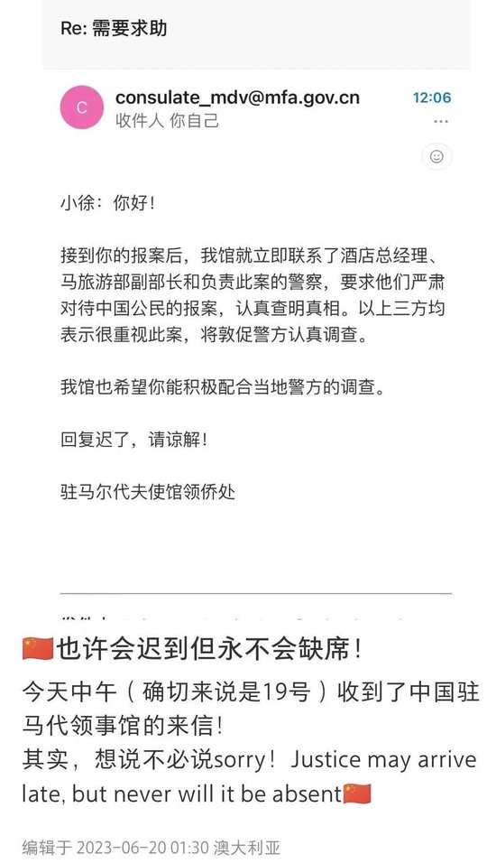 6月20日,小徐发文称,19日中午收到了中国驻马尔代夫领事馆的来信,信中称接到小徐报案后,“我馆立即联系了酒店总经理、马旅游部副部长和负责此案的警察,要求他们严肃对待中国公民的报警,认真查明真相。以上三方均表示很重视此案,将敦促警方认真调查。我馆也希望你能积极配合当地警方的调查。回复迟了,请谅解!”