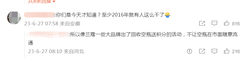 据工人日报,北京的郑女士说,她是在某社交平台看到有人回收空瓶,如今她用完的空瓶都会卖掉,“回收价格跟品相、是否有包装盒、说明书等挂钩,我现在会特地留存这些产品外包装。”