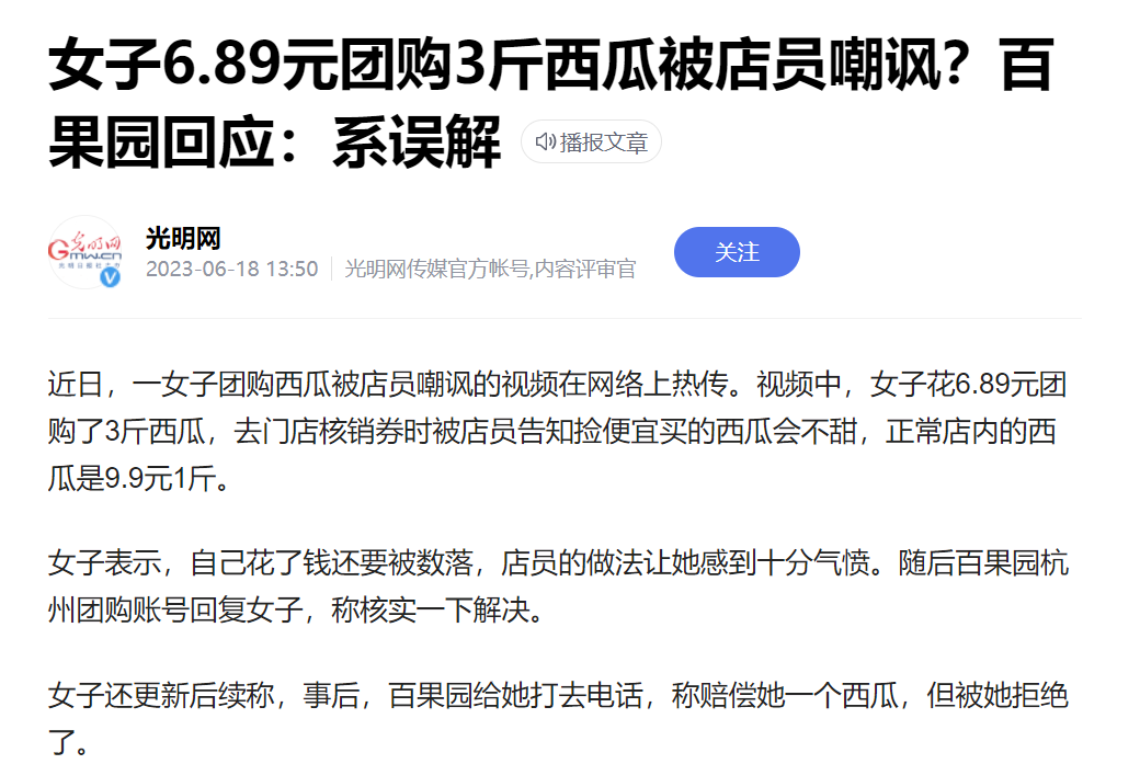 有关“权益规则”类负面信息日趋势图例1 女子吐槽百果园团购券买瓜被嘲