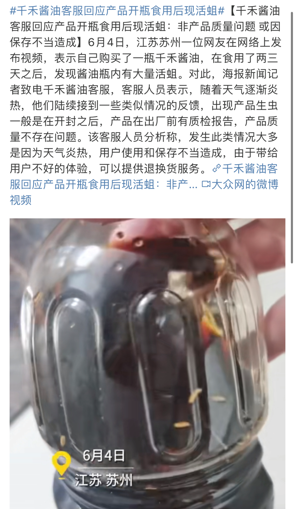 标题:千禾酱油客服回应产品开瓶食用后现活蛆:非产品质量问题 或因保存不当造成