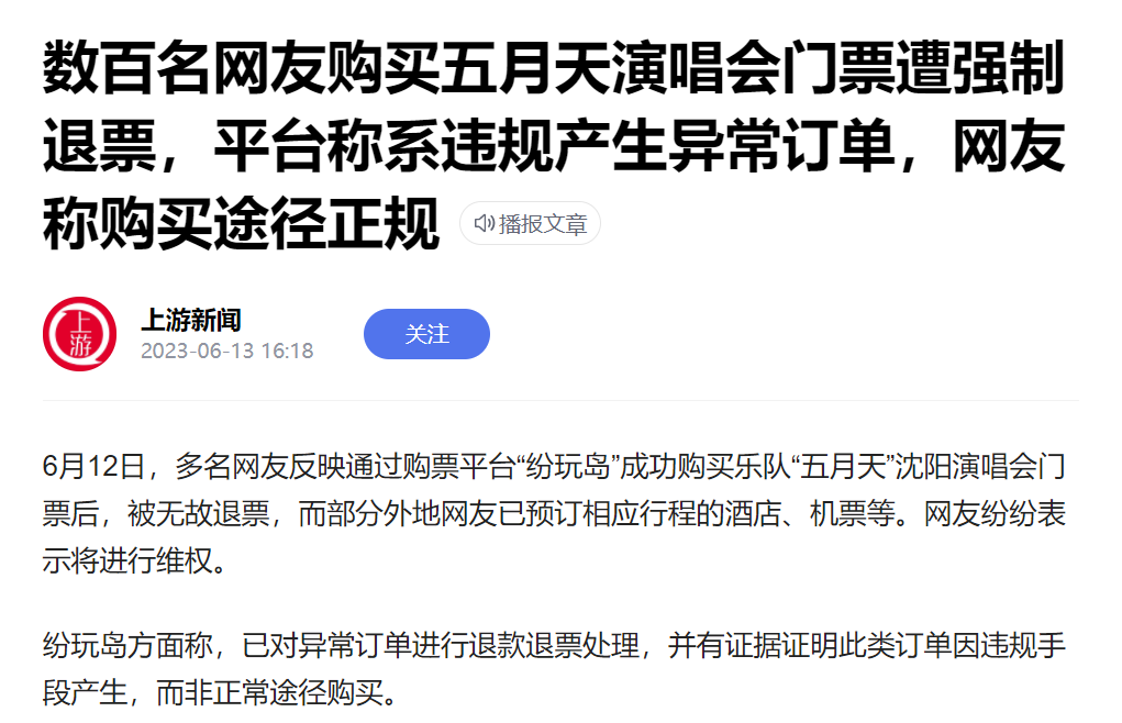 标题:数百名网友购买“五月天”演唱会门票遭强制退票,平台称系违规产生异常订单,网友称购买途径正规