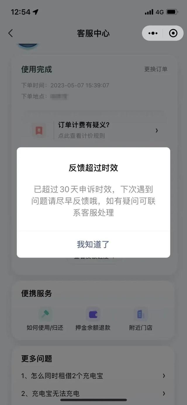 “胡乱扣费,在双浦镇灵山村扫码借取了一个共享充电宝,借出后发现此充电宝无法充电,4分钟还了,却显示一直未归还,订单扣除了99元押金。”