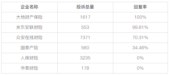 黑猫投诉财产保险公司投诉数据对比:国泰产险回复率仅三成,人保财险、华泰财险回复率为0