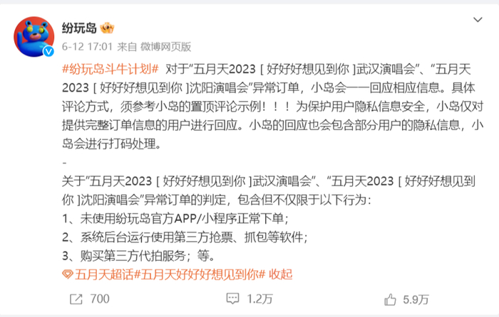 如何判定“订单异常”呢?面对众多被无故退票用户的投诉,6月12纷玩岛官方微博发布通告称“异常订单用户需按要求在评论区回复,且仅对提供完整订单信息的用户进行回应。异常订单的判定,包含但不仅限于以下行为:1、未使用纷玩岛官方APP/小程序正常下单;2、系统后台运行使用第三方抢票、抓包等软件;3、购买第三方代拍服务;等。”然而,维权群里的用户纷纷表示,他们都是通过纷玩岛APP官方渠道下单购票,符合官方的购票规则且无异常操作,纷玩岛的无故退票行为让他们无法接受。