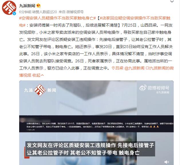 【店家回应疑空调安装操作不当致买家触电:安装师傅第一时间去了刑警队,后续进展暂不清楚】7月25日,山西吕梁。一网友发视频称,小米之家专卖店派来的空调安装人员带电操作,导致买家在自己家中触电身亡。发文网友在评论区质疑安装工违规操作:先接电后接管子,让其老公拉管子时,其老公不知管子带电,触电身亡。她还表示,事发20日,直到25日始终没有工作人员解决此事。26日,该小米之家专卖店的一工作人员表示,具体情况暂不清楚,当时涉事空调安装人员就去刑警队接受调查。26日,死者家属表示,正在协商此事。属地派出所的一工作人员表示,警方已经介入此事,正在调查之中。