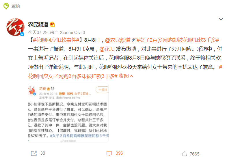 凭空多了10多倍?女子2百多网购却被花呗扣款3千多,花呗凌晨回应!