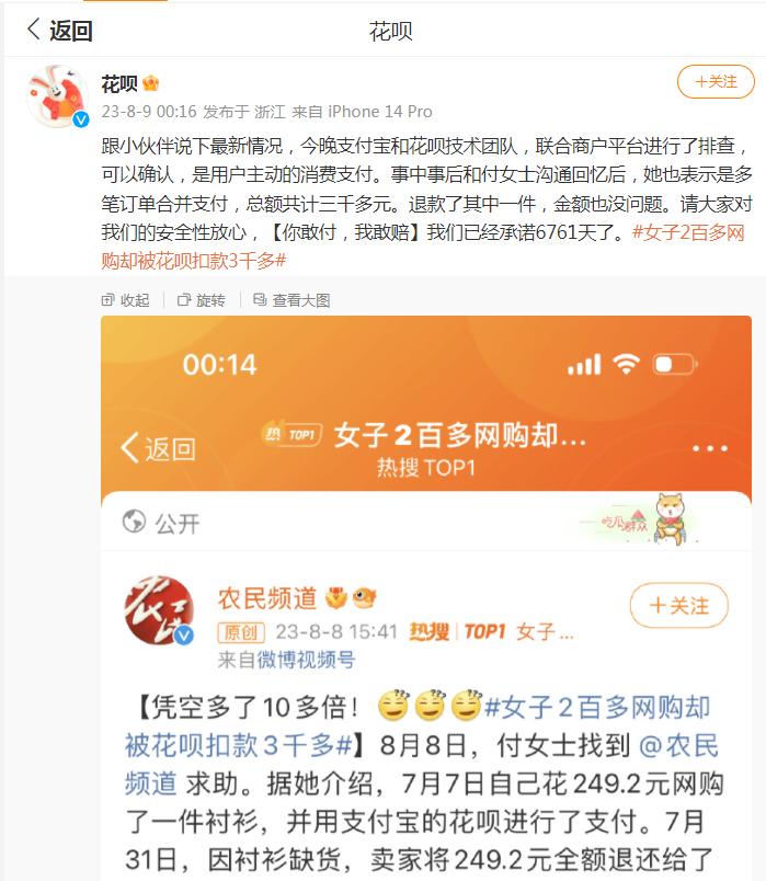 8月9日凌晨,花呗发文回应“女子2百多网购却被花呗扣款3千多”:支付宝和花呗技术团队,联合商户平台进行了排查,可以确认,是用户主动的消费支付。事中事后和付女士沟通回忆后,她也表示是多笔订单合并支付,总额共计三千多元。退款了其中一件,金额也没问题。