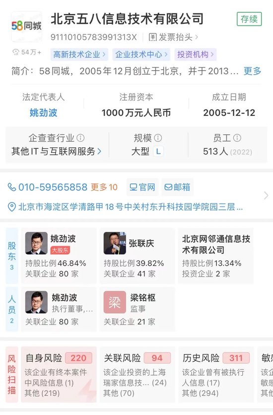 企查查信息显示,北京五八信息技术有限公司成立于2005年12月,注册资本1000万人民币,姚劲波任公司法定代表人、执行董事、总经理,并持股46.84%,为第一大股东。该公司直接持股20家企业,其中15家为存续状态,包括北京云企互联投资有限公司、五八有限公司、重庆五八新服信息技术有限公司、赶集网(天津)科技有限公司等。