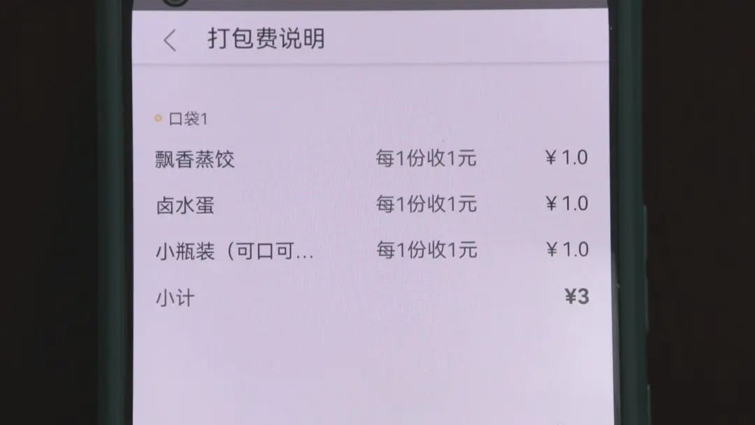 记者浏览两个外卖平台见到打包费多数是1元。记者下单一家快餐店的外卖发现:主食蒸饺打包费1元,卤水蛋打包费1元,连瓶装的小可乐也收了1元打包费。