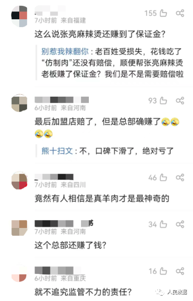 不过,对于张亮麻辣烫的这份声明,网民却不买账,认为应该追究总部监管不严的责任,而非“甩锅”给加盟店并扣除加盟店保证金。