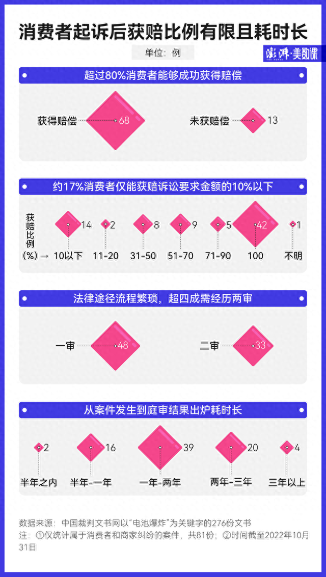 这条诉讼之路时间漫长,需要大量精力,并且不一定能获得赔偿。81 份裁判文书中,一半以上的消费者经历了两次及以上庭审,约 77% 的消费者从爆炸发生到维权结束经历了一年以上的时间。