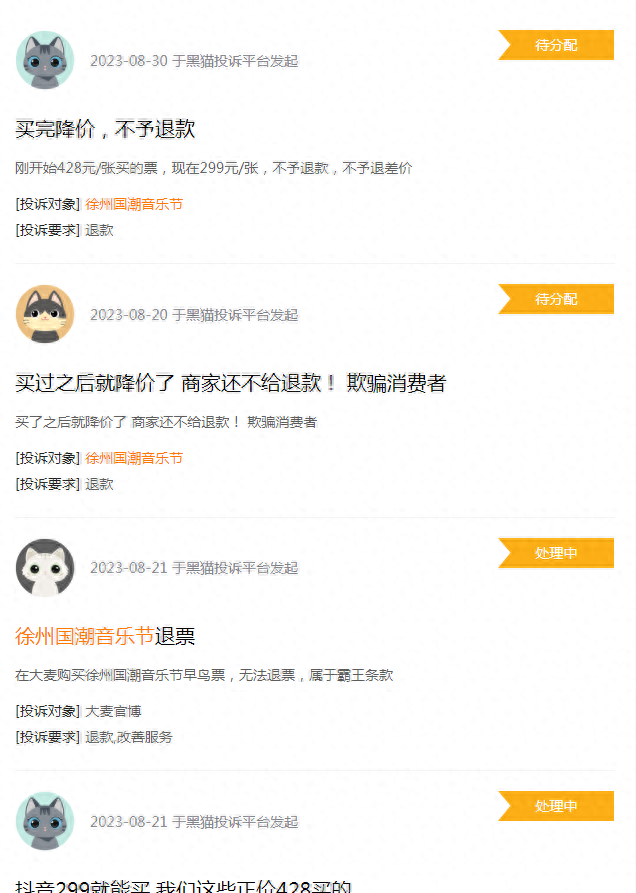 早鸟票299元便宜但不好抢,所以不少观众放弃了抢购早鸟票,直接选择了正价购票,没想到没过几天就在直播间里出现了299元的降价票,这不免使得抢购了正价票的消费者心生不满,“正价票买得真的不值得,乱价太严重。”“要是刚开始票价定得高,来的人少现场玩得也开一点,没想到后面野票这么多,又没了体验感还很贵,太恶心人了。”但也和大多音乐节类似,消费者的投诉通道并不畅通,黑猫投诉上的几十条相关投诉均未被处理。
