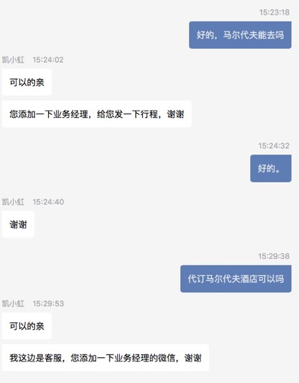 记者通过凯撒国旅官网询问是否有马尔代夫游,是否可以代理预订马尔代夫酒店,在线客服“凯小虹”告诉记者“可以的”,并且将业务经理曹经理的电话及微信推送给了记者。