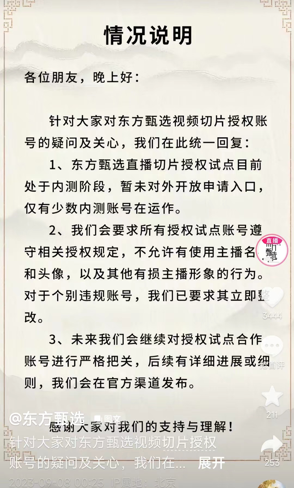 9月8日,东方甄选CEO孙东旭在抖音账号上表示,虽然授权切片业务是试点,但都签了协议,协议明确禁止在个人主页使用东方甄选主播、头像等信息,第一篇试点的账号也没有网传的上千个,仅有60个。而长期以来侵权的账号一直存在,公司一直在向平台投诉。
