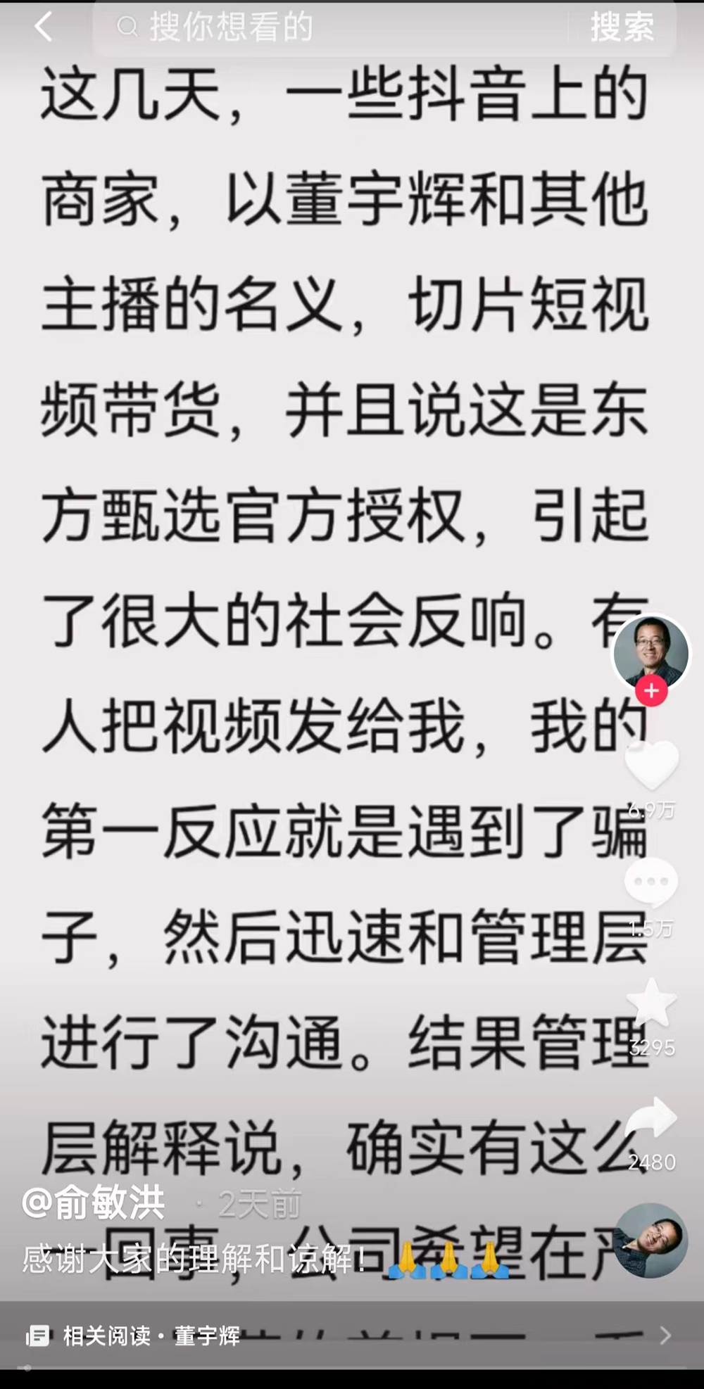 9月9日,俞敏洪在个人短视频账号发布声明称,一些抖音上的商家,以董宇辉和其他主播的名义,切片短视频带货,并且说这是东方甄选的官方授权,引起了很大的社会反响。“别人发视频给我,我的第一反应就是遇到了骗子,结果和管理层沟通后,管理层解释称‘确实有这么一回事’。”