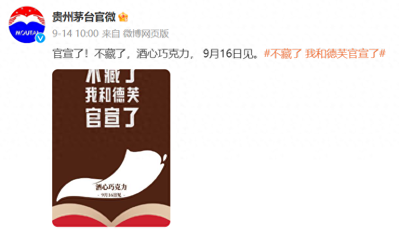 “酱香拿铁”余热未散,茅台官微再宣“新欢”——与德芙巧克力9月16日推出联名酒心巧克力。该话题随即又引来大批网友热议,还登上热搜第一。据媒体报道,茅台巧克力的德芙官方渠道发售秒空,“一粒难求”。在二线市场,原价179元一盒的茅台巧克力,售价炒到了319元每盒。
