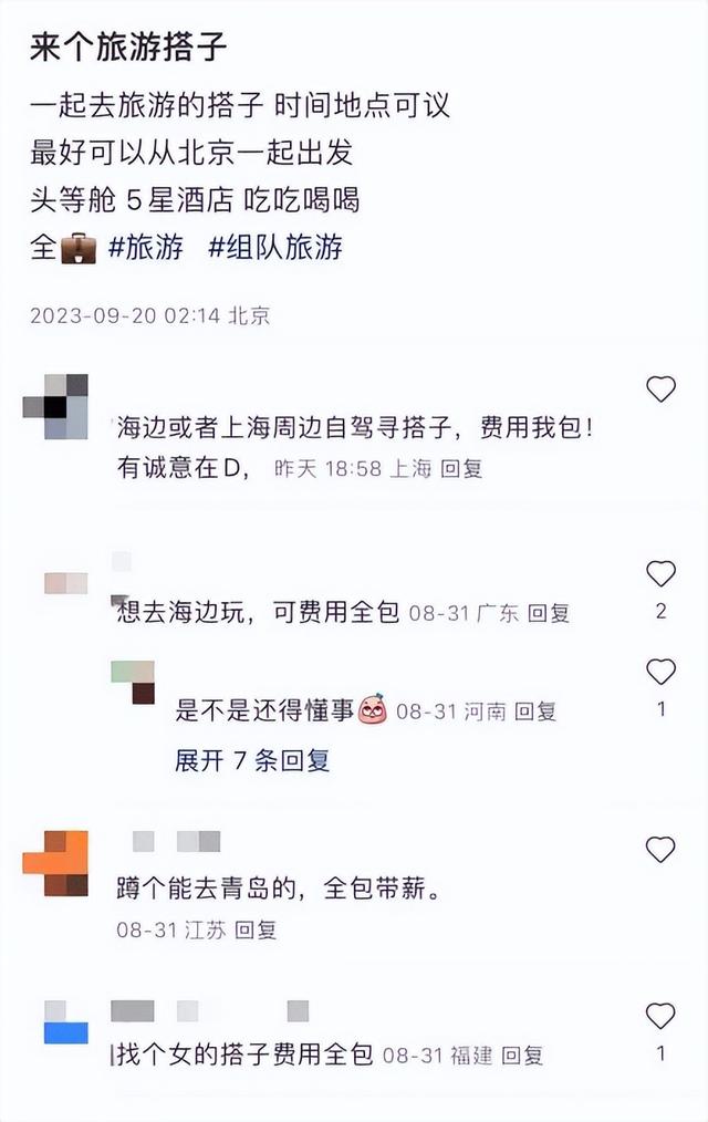 还有人在自称“旅游费用全包”的帖子里附带了自己的年龄、身高等自我介绍,以及对女方的年龄、性格要求。在另一篇正常寻找“旅游搭子”的帖子里,评论区也有多人留言称“找个女搭子,费用全包”“蹲个能去xx的,全包带薪”。