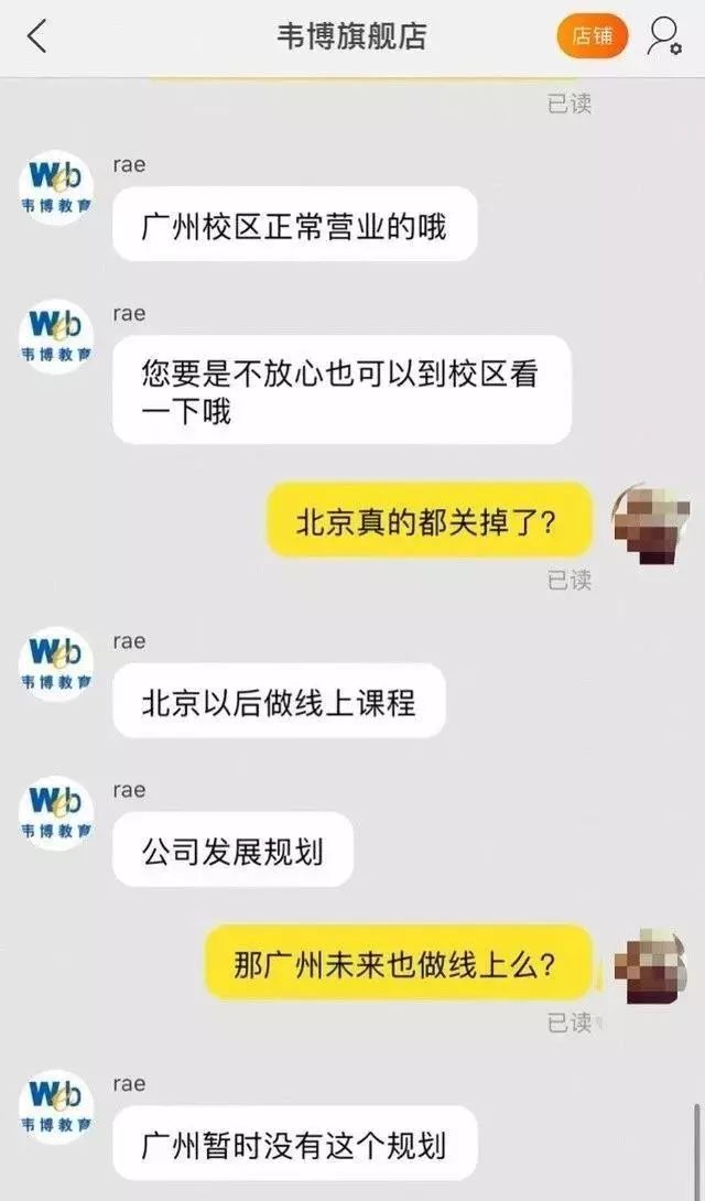 韦博旗舰店的客服告诉记者,目前广州校区仍正常营业,“北京以后做线上课程”。