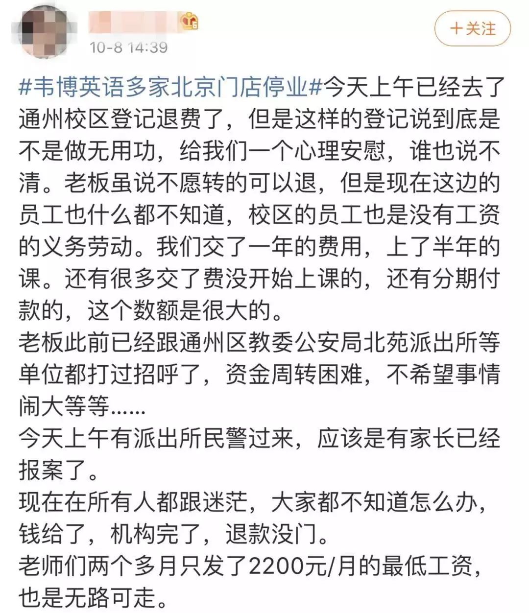“韦博英语北京公司将宣布破产,北京各中心以装修或系统升级的名义停止运营,学员会员费与员工工资均无处追讨......”