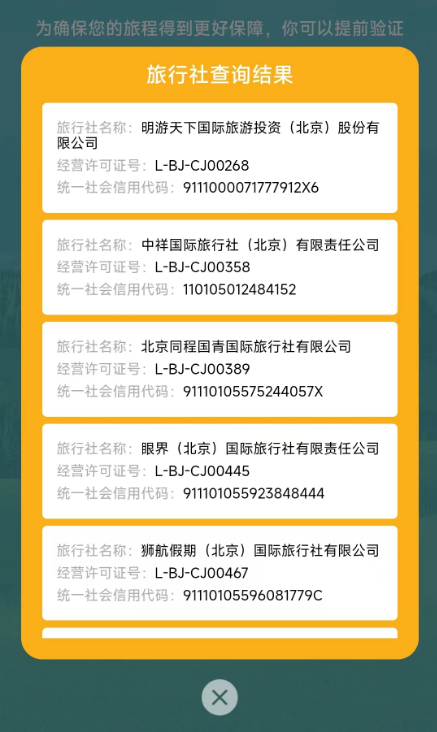 输入旅行社名称进行验证,查询结果包括旅行社的经营许可证号及统一社会信用代码,方便出现问题后找相应的属地监管部门反馈。
