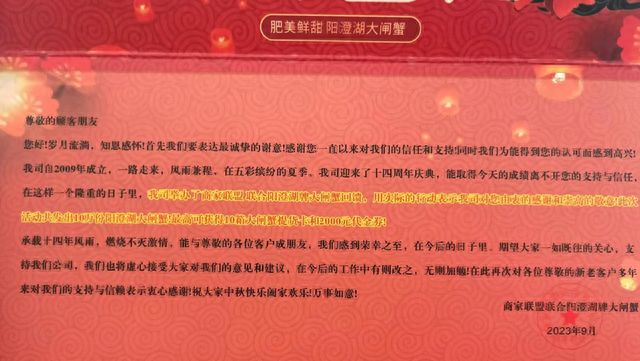 另一位广东的网友所收到的蟹卡同样附带类似措辞的《致尊贵客户的一封信》,称“天猫携全体员工向您及家人致以最诚挚的祝福”“随机抽取十万名在平台有五年以上购物记录的活跃用户赠送2388型(价值约500元)鲜活螃蟹提货卡”。