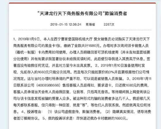 事实上,涉及天津龙行天下商务服务有限公司的消费者投诉,多年来时有发生,且情节类似。