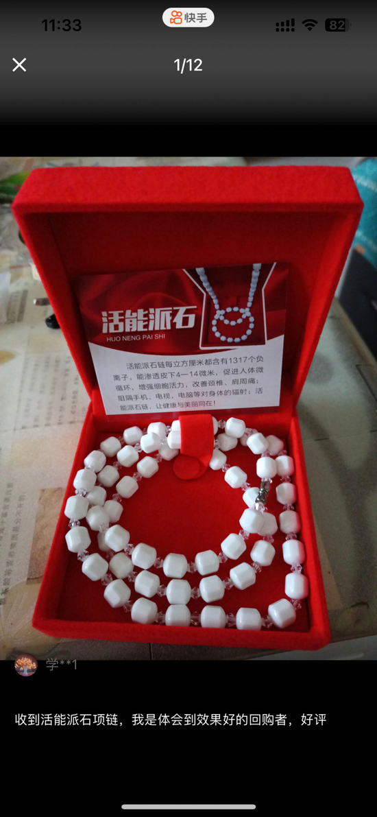 即便是售卖普通饰品的直播间也想来分一杯羹。今年2月,堆堆(化名)的姥姥在直播间有一条“活能派派石项链”。堆堆告诉记者这条项链主播声称“带上就可以让偏瘫患者直接站起来行走”,是“心脏病患者的福音”。