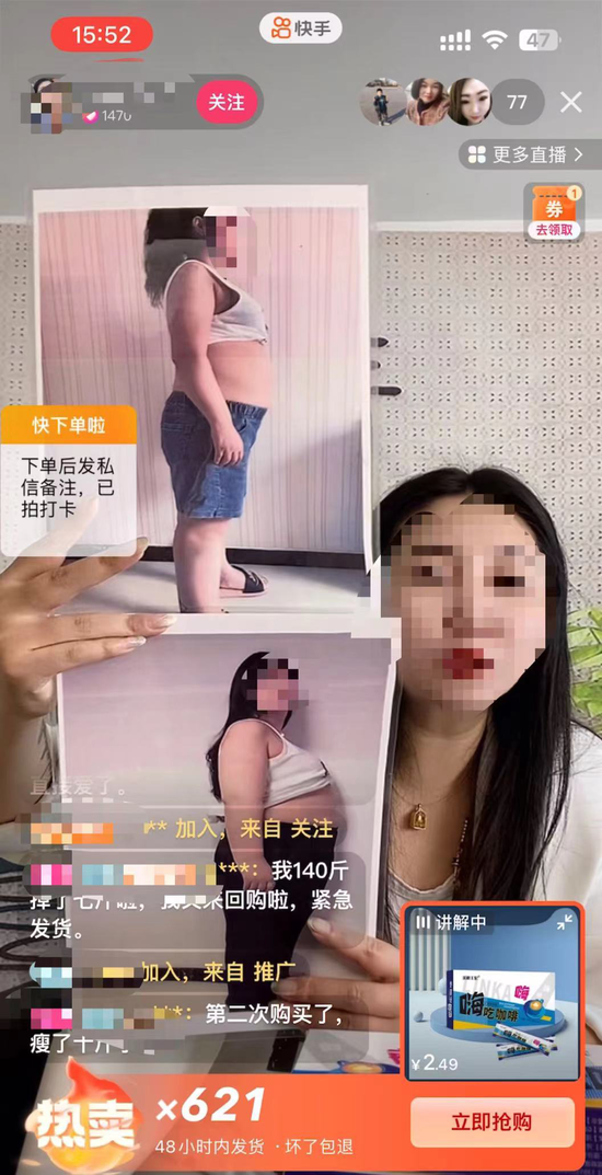 亲身经历铺垫,饥饿营销下套。“四盒49.8元,我今天只放出10单,大家自己拼手速”。9月20号的这场直播一开始,主播便表示今天价格十分便宜,只能亏本出售10单。而她亏本也要卖的目的仅仅是为了与这十个消费者一起打卡,坚持喝这款产品减肥。然而一分钟过后,直播页面弹出提示,显示主播已热卖621单。